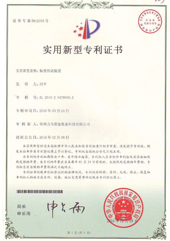 專利證書(標(biāo)簽傳送裝置)