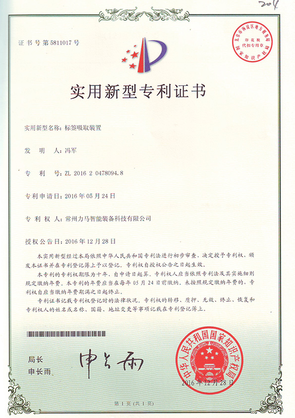 專利證書(標(biāo)簽吸取裝置)