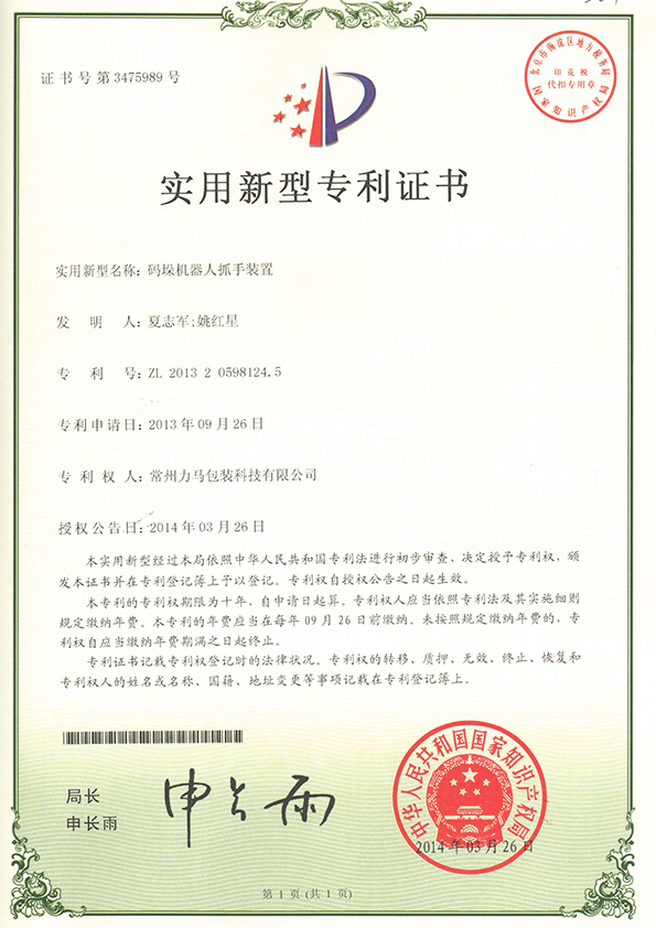 碼垛機(jī)器人抓手專利證書